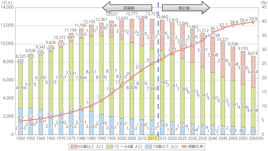 2010年までは国勢調査、2013年は人口推計12月1日確定値、2015年以降は国立社会保障・人口問題研究所「日本の将来推計人口(平成24年1月推計)」の出生中位・死亡中位仮定による推計結果